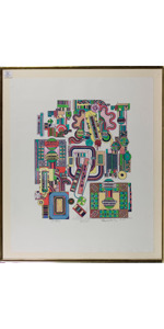 L’opera olio e collage su carta applicata su tela cm. 68 x 71 stimata da Sotheby’s nel 2015 60/80000 euro, proveniente dalla Galleria la Scaletta di Milano (vedasi documentazione allegata), è stata riprodotta e riportata a colori sul manifesto. Un esemplare dei 145 manifesti tirati è stato proposto da Ambrosiana Casa d’Aste di Milano nell’asta n. 23 del 6/11/2018 con una stima di 1.500/2.000 euro.