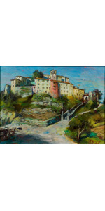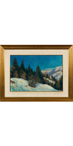 L’opera fu esposta a Ca' Pesaro a Venezia nel 1910 e nel 1911. Diverse esposizioni in personali e collettive nel tempo. Lavoro che riassume felicemente il percorso artistico del pittore carnico. La composizione converge sulla figura femminile sullo sfondo, animata dal contrasto fra il bianco della neve e il bruno delle casette, dalle quali si intravede la luce calda del fuoco del “ fogolar “, il tutto avvolto dalle montagne azzurrine e da un cielo sullo sfondo percorso da nubi. D’Avanzo trova in questa opera gli aspetti più salienti della sua amata Carnia. Proveniente da noto collezionista. Etichetta d'epoca "Stabilimento Tipografico Carnia, Tolmezzo" sul retro.