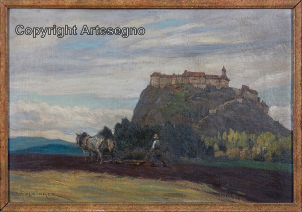 Title: Burg Hochosterwitz, davor pflugender Bauer.