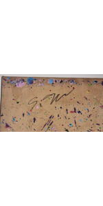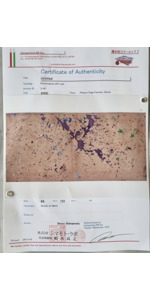 Certificato di autenticità a cura dell' Associazione Shozo Shimamoto, con n archivio ID 1060. Opera esposta nella mostra "Shozo Shimamoto, Gutai works", 24.08.1997 - 04.10.1997, Hundermart-Koln Gallery, Germania, 1997. Fotografia dell'artista con alle spalle l'opera sul retro